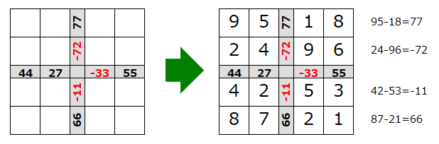 下のパズルを解いて、左上から右下の対角線に入ったマスの数字を上から順に答えてください。